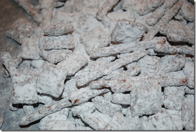 3. Pour mixture by batches into a gallon baggie. Make sure it seals SECURELY! Otherwise there will be powdered sugar all over your kitchen (it’s been known to happen). Add powdered sugar. It’s better to have more than not enough so pour a little heavy handed.